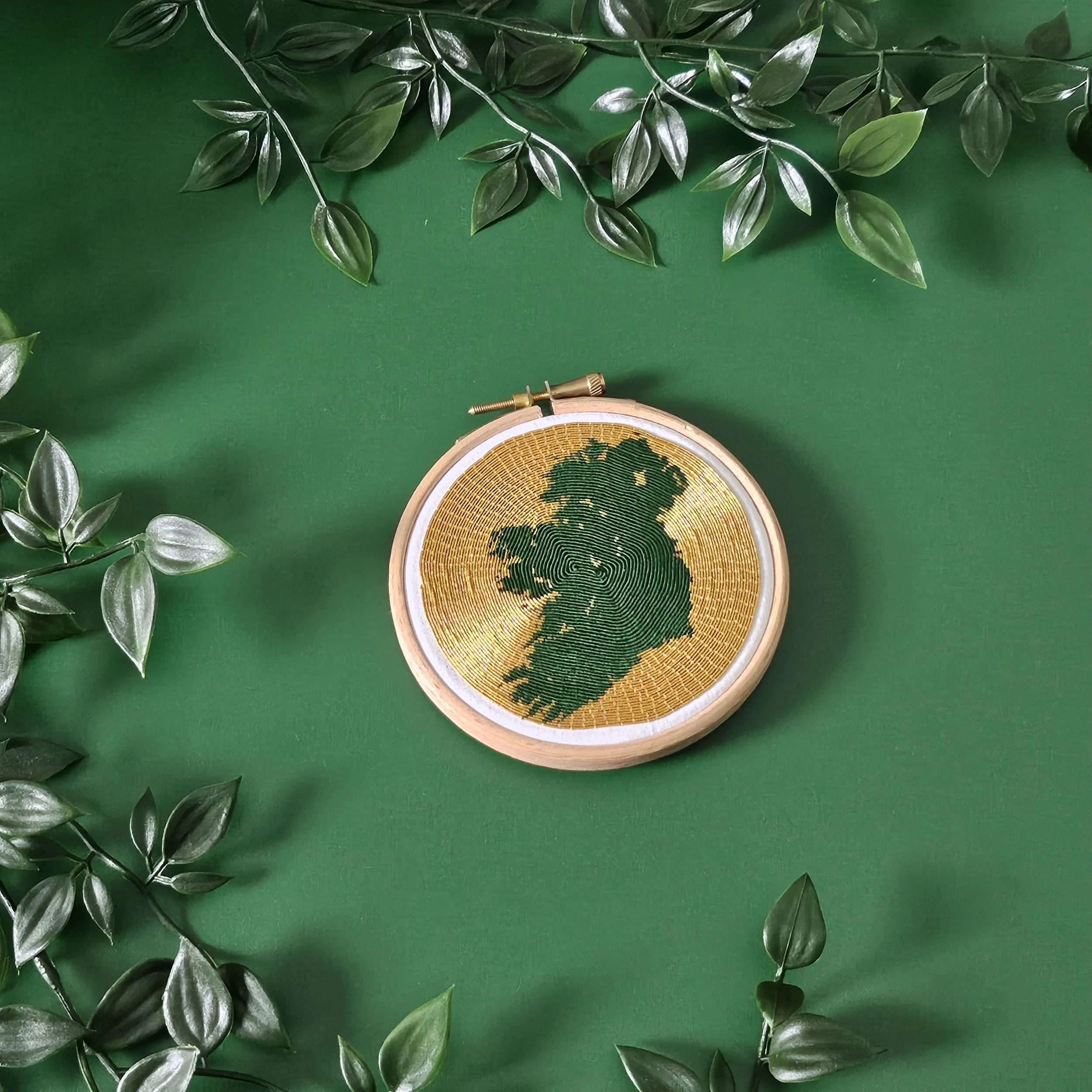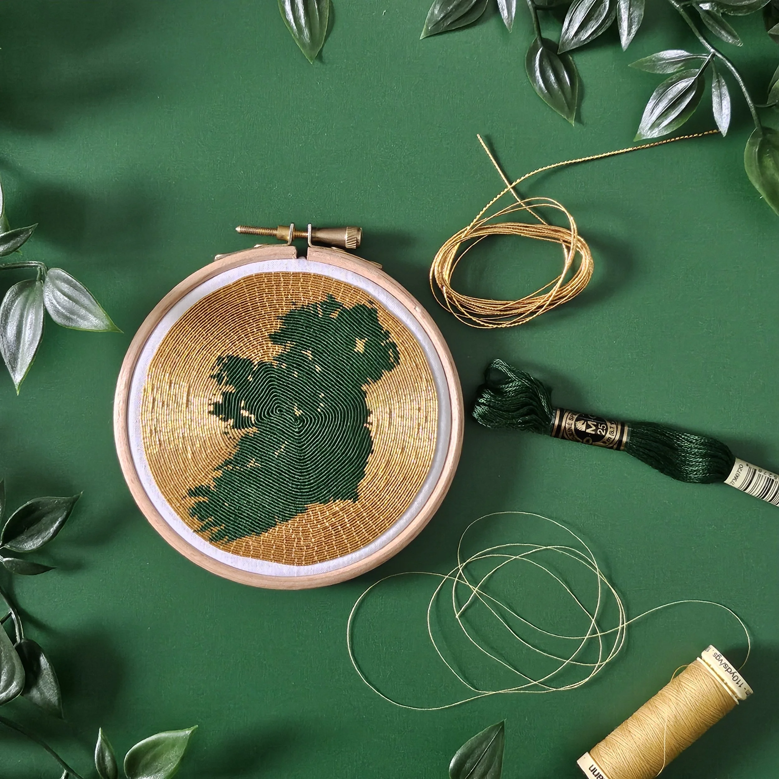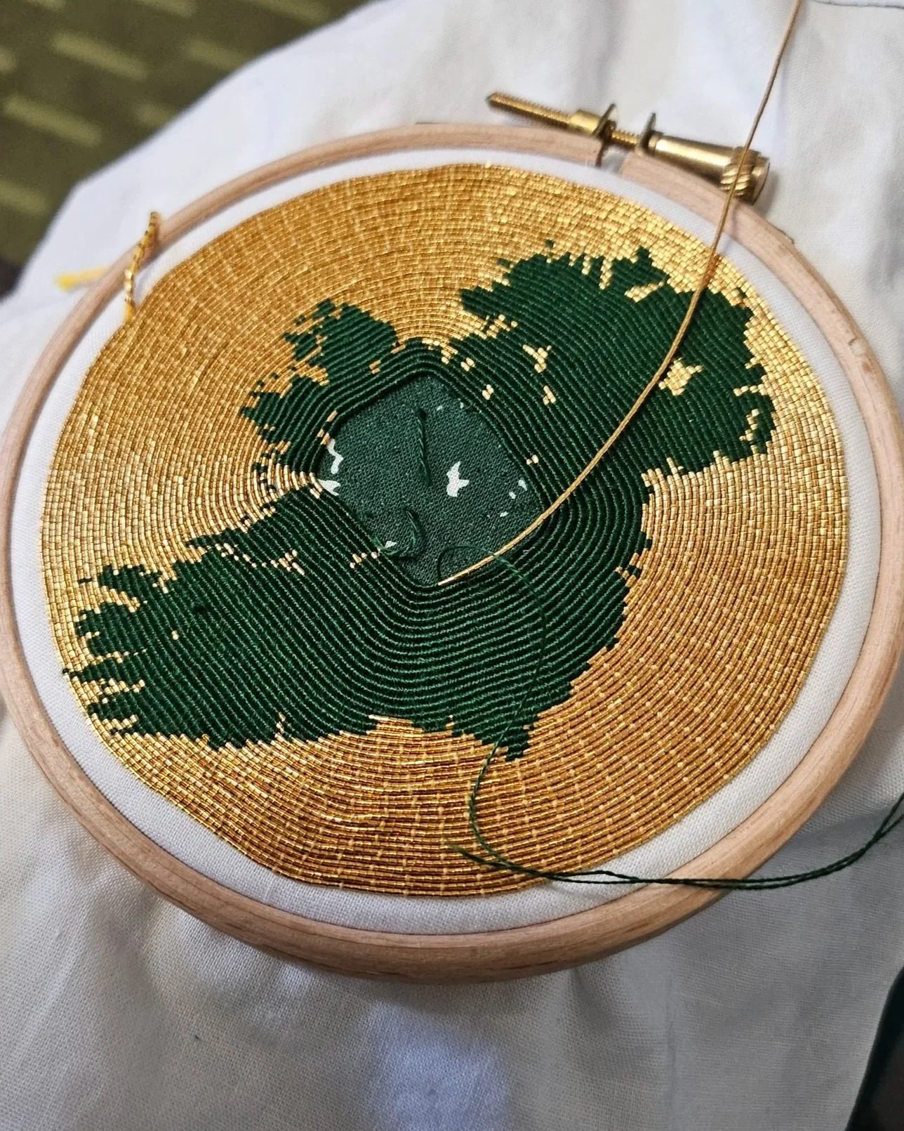 We're doing a Goldwork technique called or nué for this one - using a whole 10 metres of gold thread! This is a technique called or nué. We're going to be completely covering the fabric with gold thread, but covering it in parts with green thread to create a pattern. Or nué (and a lot of goldwork) is a couching technique. So although there’s lot of gold thread, we’re not actually stitching with it. We’re just stitching it into place with regular old sewing thread!
